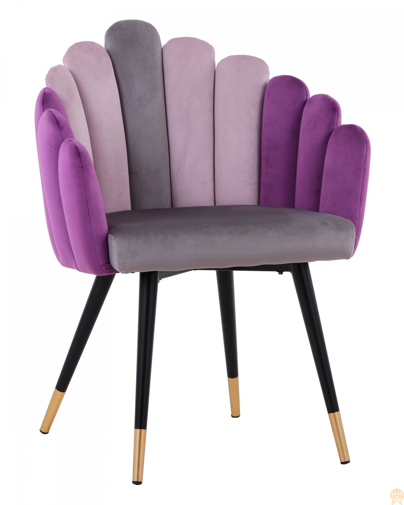 Яркое многоцветное кресло с обивкой из прочного велюра. Надежная опора достигается благодаря металлическому каркасу и удобным устойчивым ножкам с золотым декором. Спинка с оригинальным дизайном украшена широкими полосами в виде веера.
