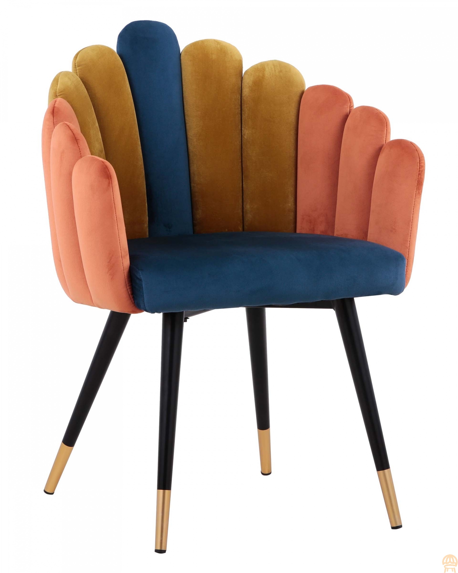 Яркое многоцветное кресло с обивкой из прочного велюра. Надежная опора достигается благодаря металлическому каркасу и удобным устойчивым ножкам с золотым декором. Спинка с оригинальным дизайном украшена широкими полосами в виде веера.